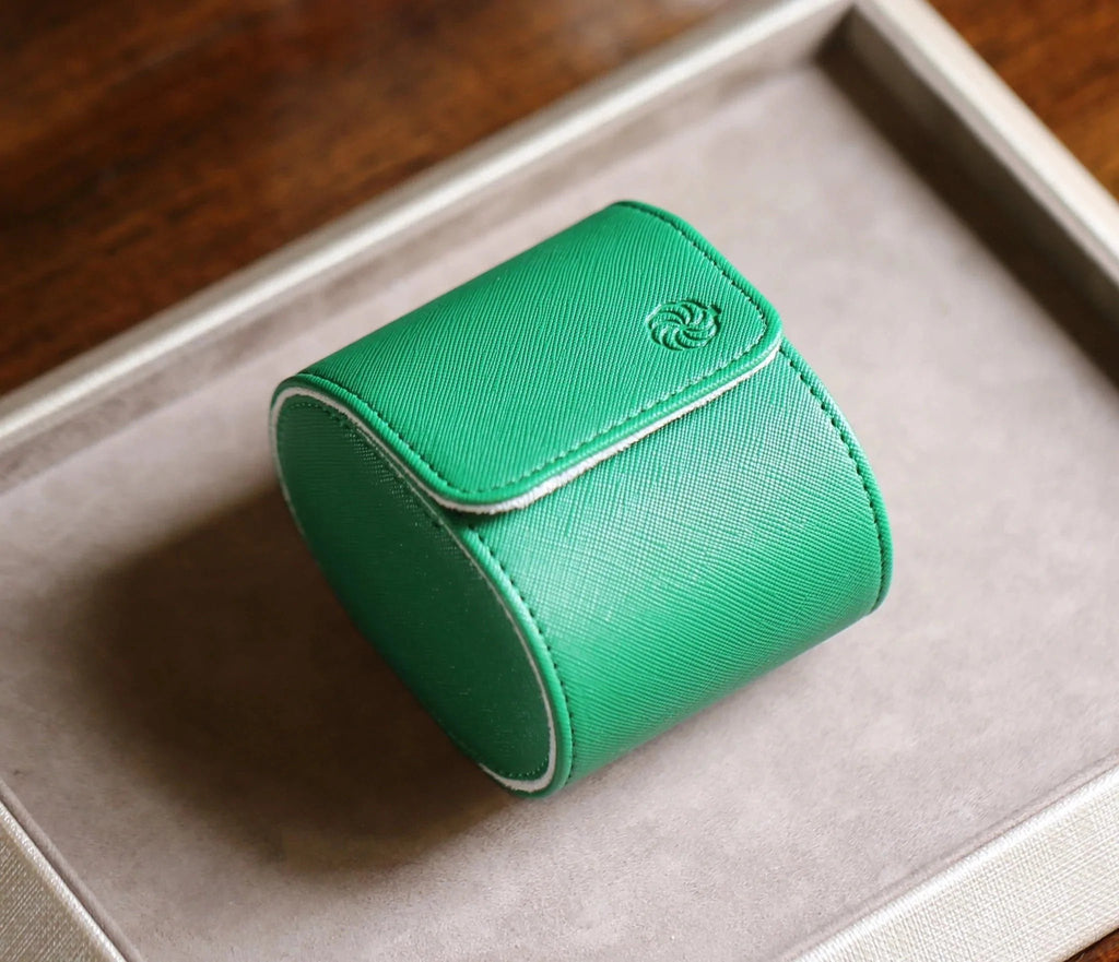 The Arev & Co. Green watch roll features a detachable inner cushion within a sturdy vegan leather exterior. It provides secure storage for your watch when on the go.